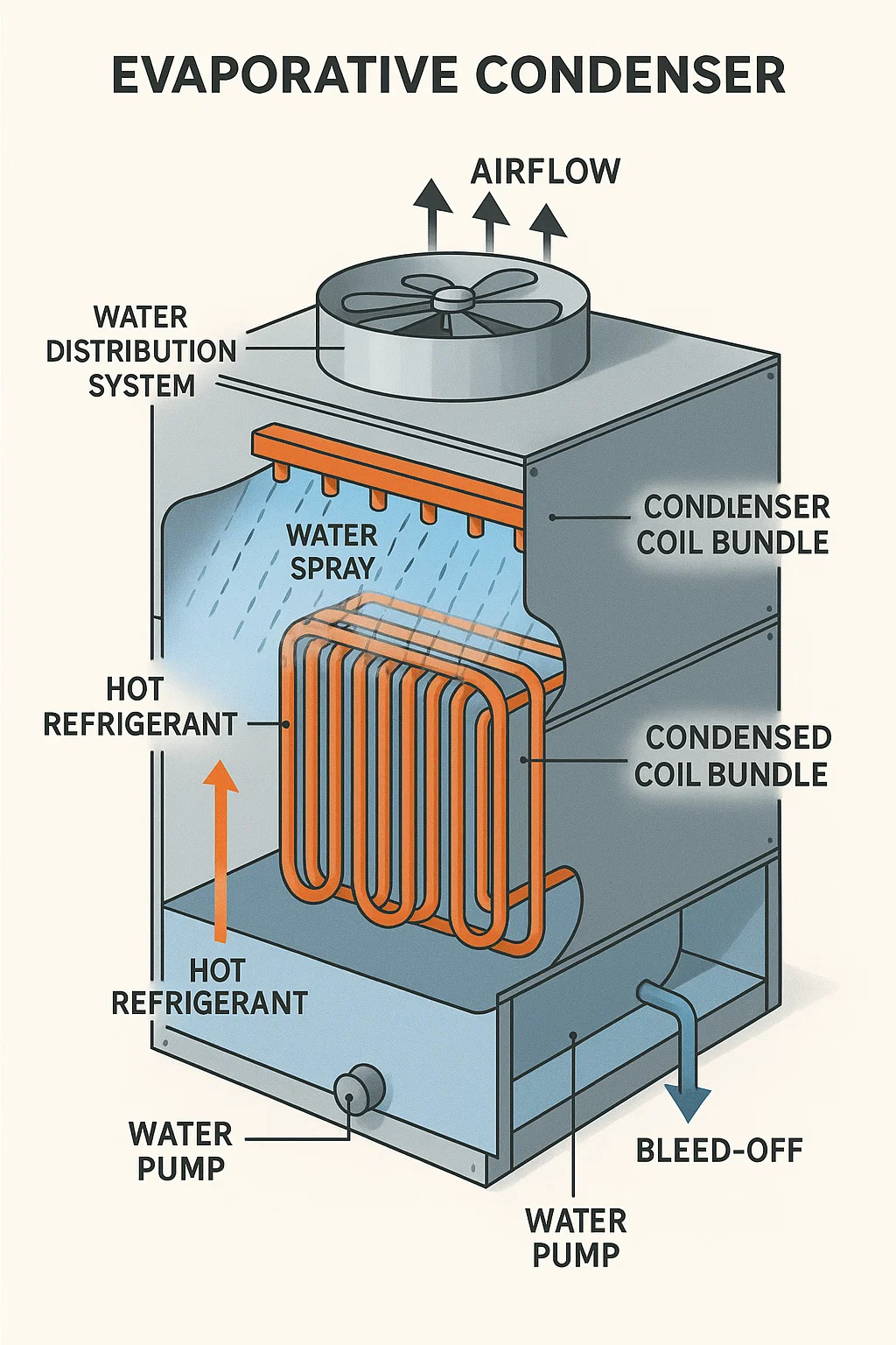 ان المكثف التبخيري يدمج تبريد الهواء وتبخر الماء لرفض الحرارة من أنظمة التبريد. ويختلف تصميمها وتشغيلها بشكل أساسي عن المكثفات القياسية المبردة بالهواء: